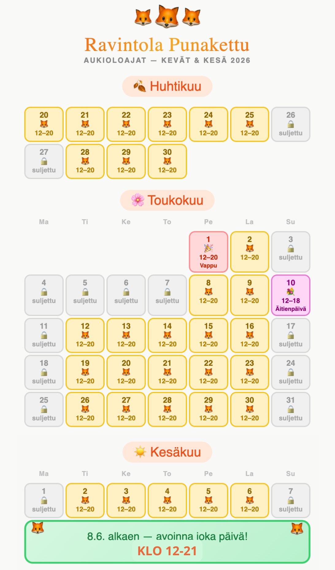 When your stomach is growling and your mouth is watering, what do you do? When you want to get your groove on, what then? Luckily there’s Punakettu where you can find a restaurant and a pub. Down below you can find out when to visit us.